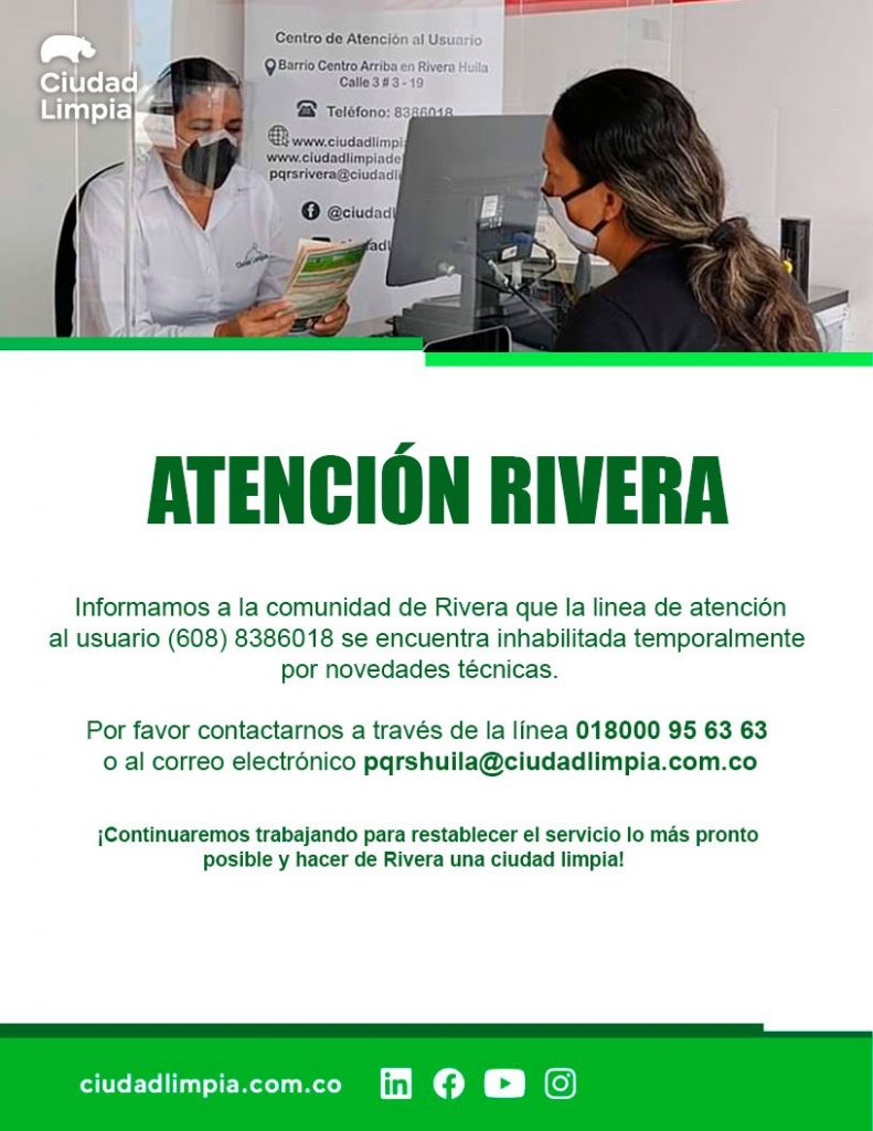 Informamos a la comunidad Riverense que la línea de atención al usuario (608)8386018 se encuentra inhabilitada temporalmente por novedades técnicas, por lo cual los invitamos a contactarnos a través de la línea 018000956363 o a del correo electrónico pqrshuila@ciudadlimpia.com.co.